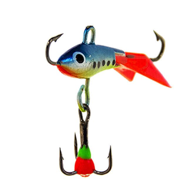 Цвет балансира под кодом 003 содержит в основном синие тона с добавлением в точек на боковую поверхность, хвостовое оперение ярко красного цвета, по середине корпуса закреплен тройник с яркими бусинами, который можно снять при необходимости.